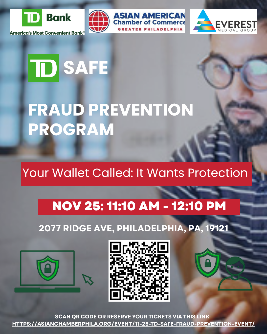The Asian American Chamber of Commerce is proud to host a TD SAFE Fraud Prevention Program for the seniors supported by Everest Medical Group. This informative session is designed to help you understand today’s most common scams, recognize red flags, and learn practical steps to keep your personal and financial information secure. By bringing together community partners and trusted experts, this workshop aims to empower seniors with the knowledge and confidence they need to stay safe.